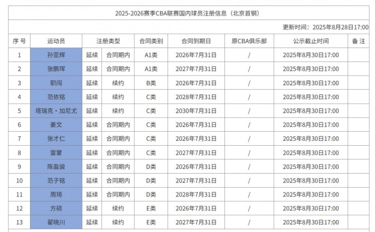 8月28日讯 CBA官网更新了北京男篮新赛季的国内球员注册信息,北京共注册了13人。