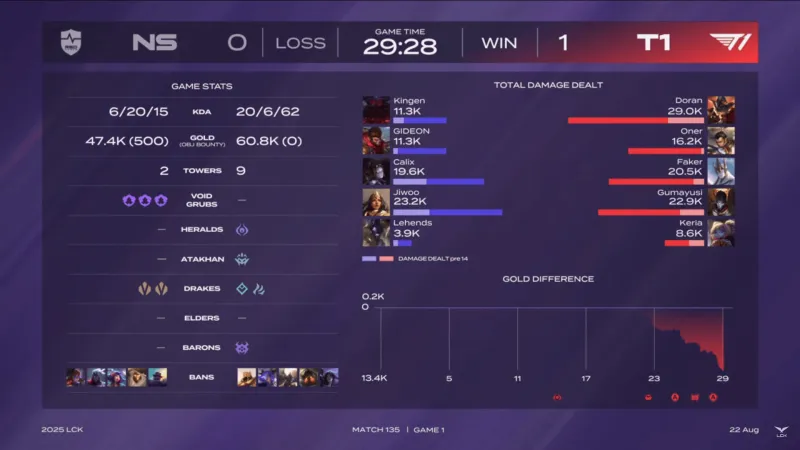 比赛第25分钟,两队在下路爆发团战,NS牛头发条打出小配合顶起三人,但T1轻松打出1换5团灭NS。