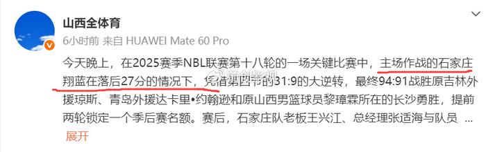 中国篮坛又出现史册性大逆转了。2025年NBL联赛第18轮,石家庄男篮迎战长沙男篮。石家庄队在一度落后27分的情况下,末节比赛觉醒,轰出一波31-9的进攻高潮,彻底扭转场上局势,最终以94-91击败对手,成功逆转对手的同时,提前两轮锁定季后赛席位。面对拥有琼斯、约翰逊以及威尔斯三大CBA外援坐镇的长沙队,石家庄能够上演27分大逆转,确实让人倍感意外。而作为辽篮外援,威尔斯加盟长沙队首秀则被搞砸了,惨遭对手27分大逆转。